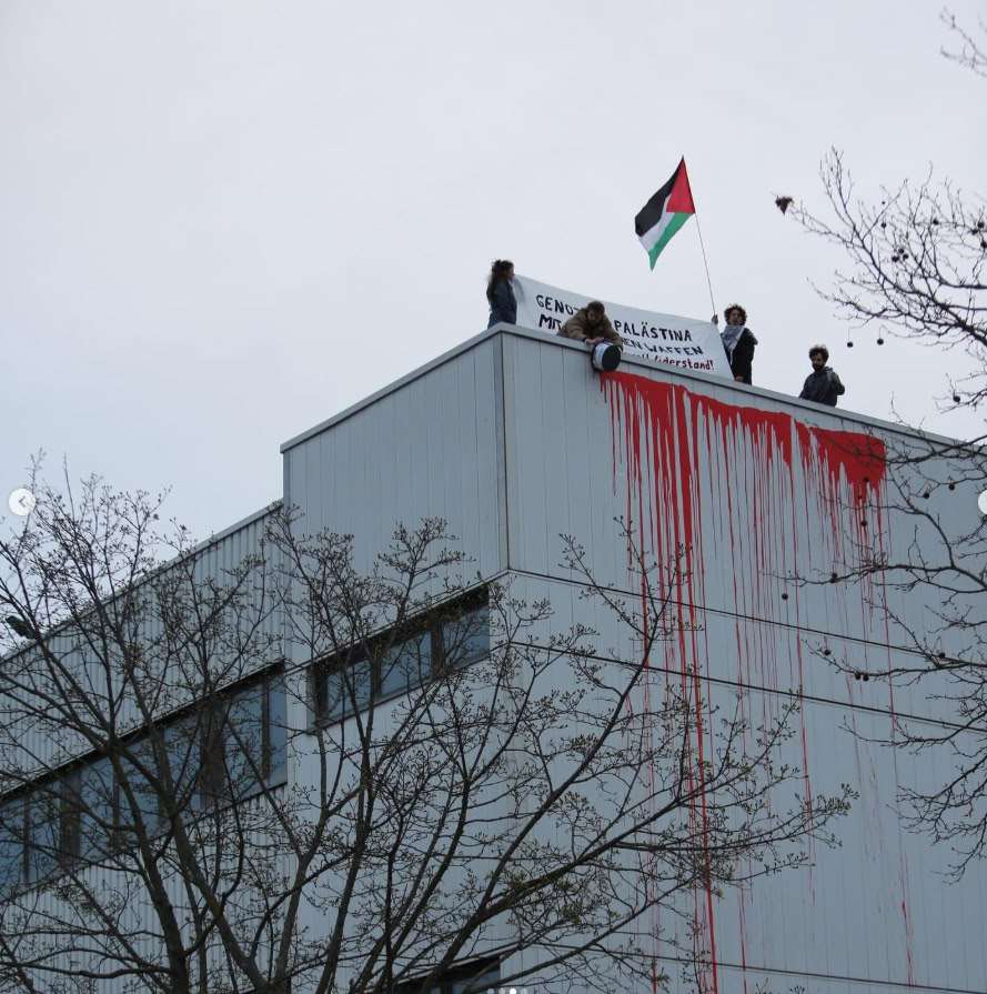 Die Aktivist:innen, die mit einer Leiter auf die Fabrik stiegen, riefen zum Widerstand gegen Waffenlieferungen an Israel und den Genozid in Palästina auf. Zudem laden sie zu einem Informationsvortrag im nahegelegenen Nachbarschaftszentrum am Sonntagabend ein.